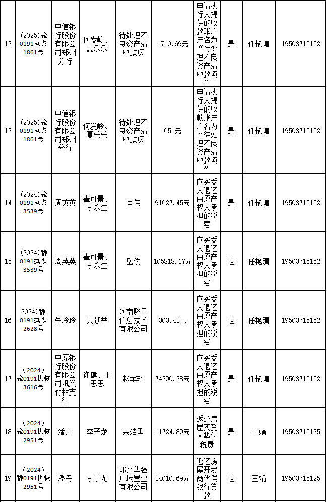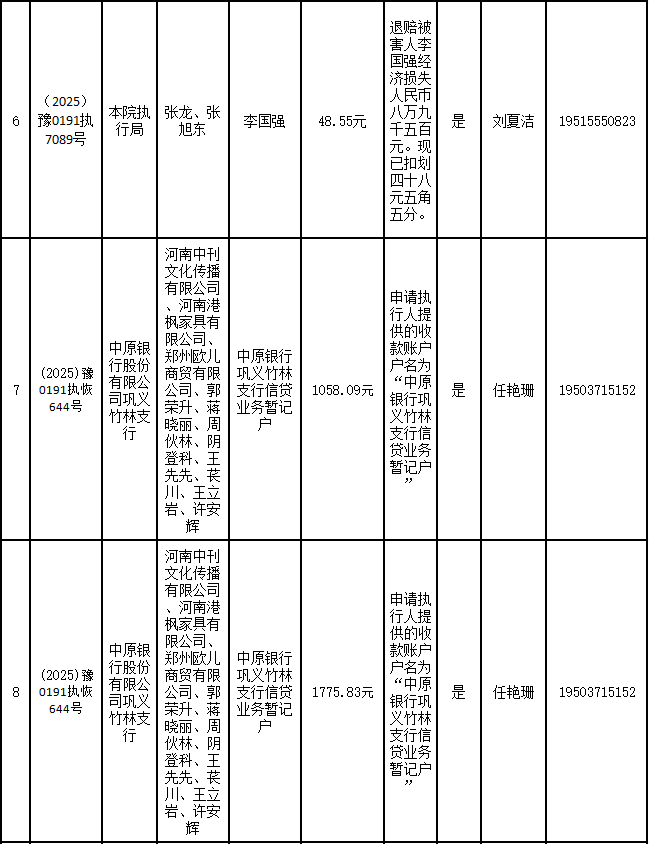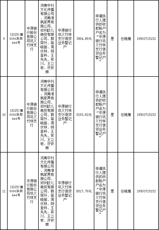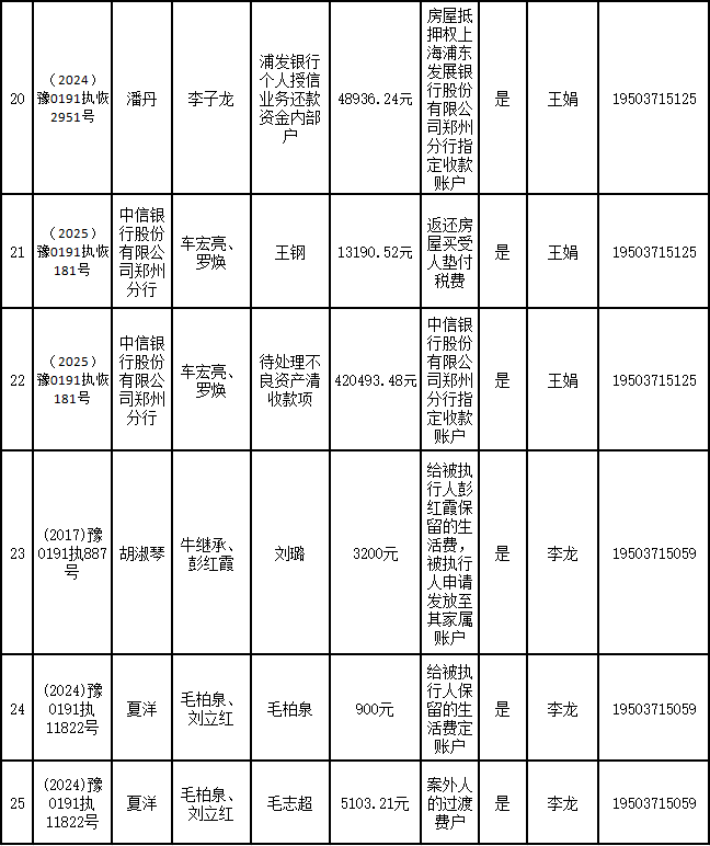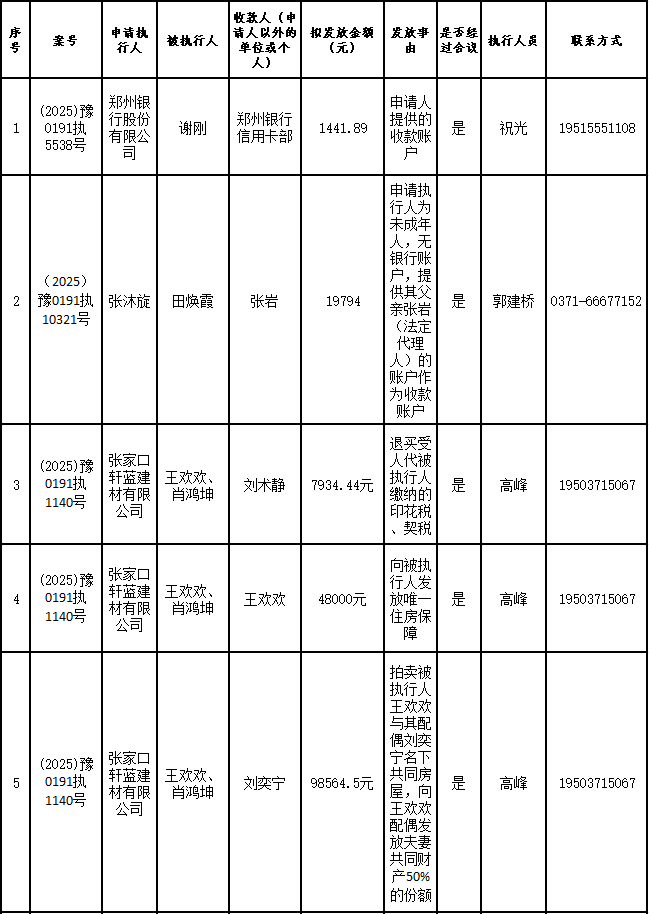 为进一步严格管理执行案款发放,强化执行案款管理,依法维护当事人合法权益,防范廉政风险,确保执行案款发放规范有序、及时高效。根据《最高人民法院关于执行款物管理工作的规定》及《最高人民法院关于进一步规范人民法院执行案款收发的通知》等相关规定,现对以下执行案款发放事宜进行公示,公示期为3个自然日(2025年9月24日—2025年9月26日),案件当事人或者其他利害关系人如有异议应当在公示期内提出并提交相关证据材料,公示期满无异的,本院将按照执行案款管理的相关规定办理发放手续。