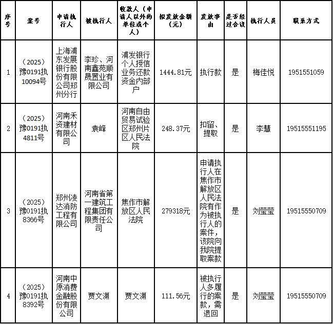 为进一步严格管理执行案款发放,强化执行案款管理,依法维护当事人合法权益,防范廉政风险,确保执行案款发放规范有序、及时高效。根据《最高人民法院关于执行款物管理工作的规定》及《最高人民法院关于进一步规范人民法院执行案款收发的通知》等相关规定,现对以下执行案款发放事宜进行公示,公示期为3个自然日(2025年9月25日—2025年9月27日),案件当事人或者其他利害关系人如有异议应当在公示期内提出并提交相关证据材料,公示期满无异的,本院将按照执行案款管理的相关规定办理发放手续。
