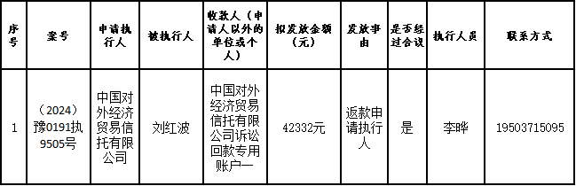 为进一步严格管理执行案款发放,强化执行案款管理,依法维护当事人合法权益,防范廉政风险,确保执行案款发放规范有序、及时高效。根据《最高人民法院关于执行款物管理工作的规定》及《最高人民法院关于进一步规范人民法院执行案款收发的通知》等相关规定,现对以下执行案款发放事宜进行公示,公示期为3个自然日(2025年9月29日—2025年10月1日),案件当事人或者其他利害关系人如有异议应当在公示期内提出并提交相关证据材料,公示期满无异的,本院将按照执行案款管理的相关规定办理发放手续。