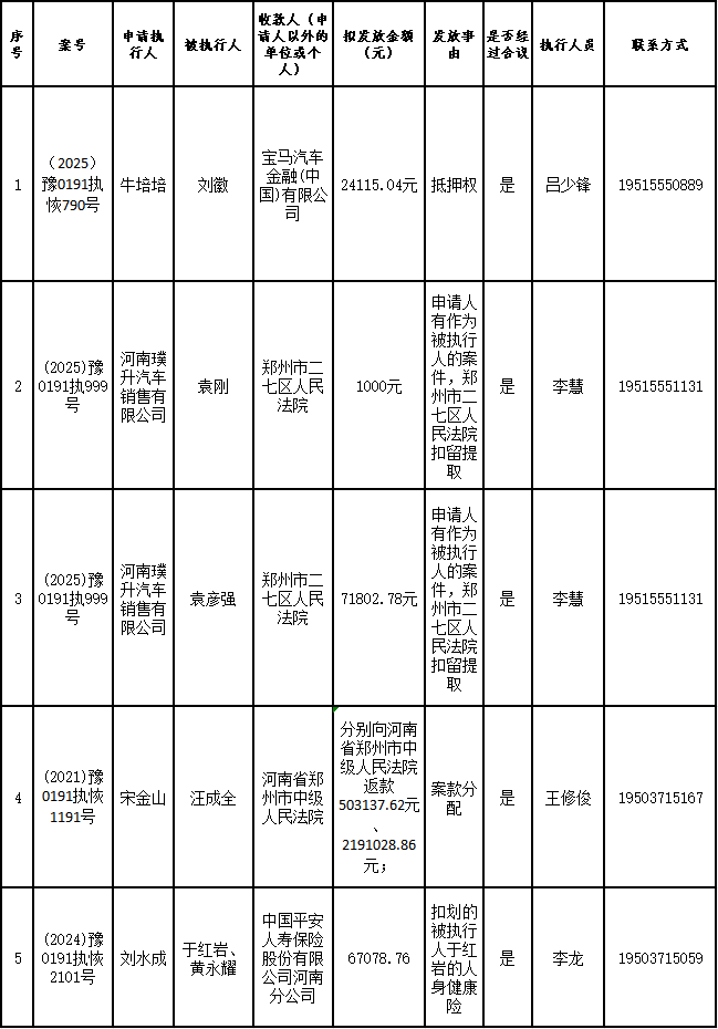 为进一步严格管理执行案款发放,强化执行案款管理,依法维护当事人合法权益,防范廉政风险,确保执行案款发放规范有序、及时高效。根据《最高人民法院关于执行款物管理工作的规定》及《最高人民法院关于进一步规范人民法院执行案款收发的通知》等相关规定,现对以下执行案款发放事宜进行公示,公示期为3个自然日(2025年10月16日—2025年10月18日),案件当事人或者其他利害关系人如有异议应当在公示期内提出并提交相关证据材料,公示期满无异的,本院将按照执行案款管理的相关规定办理发放手续。