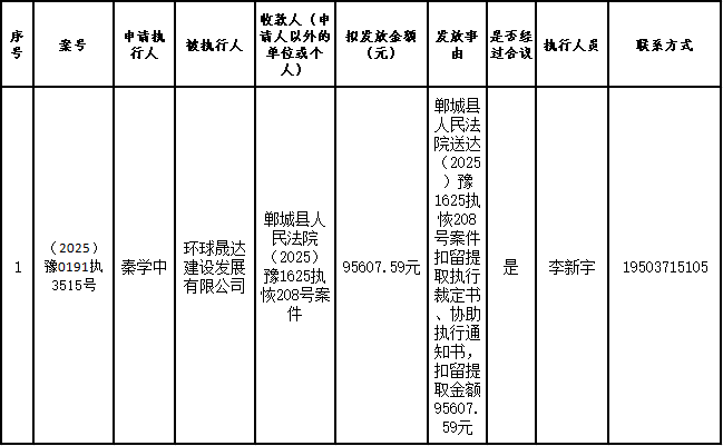 为进一步严格管理执行案款发放,强化执行案款管理,依法维护当事人合法权益,防范廉政风险,确保执行案款发放规范有序、及时高效。根据《最高人民法院关于执行款物管理工作的规定》及《最高人民法院关于进一步规范人民法院执行案款收发的通知》等相关规定,现对以下执行案款发放事宜进行公示,公示期为3个自然日(2025年10月18日—2025年10月20日),案件当事人或者其他利害关系人如有异议应当在公示期内提出并提交相关证据材料,公示期满无异的,本院将按照执行案款管理的相关规定办理发放手续。