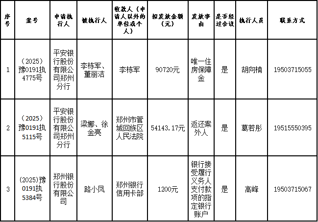 为进一步严格管理执行案款发放,强化执行案款管理,依法维护当事人合法权益,防范廉政风险,确保执行案款发放规范有序、及时高效。根据《最高人民法院关于执行款物管理工作的规定》及《最高人民法院关于进一步规范人民法院执行案款收发的通知》等相关规定,现对以下执行案款发放事宜进行公示,公示期为3个自然日(2025年10月28日—2025年10月30日),案件当事人或者其他利害关系人如有异议应当在公示期内提出并提交相关证据材料,公示期满无异的,本院将按照执行案款管理的相关规定办理发放手续。