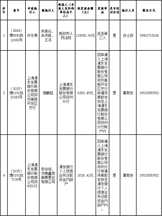 为进一步严格管理执行案款发放,强化执行案款管理,依法维护当事人合法权益,防范廉政风险,确保执行案款发放规范有序、及时高效。根据《最高人民法院关于执行款物管理工作的规定》及《最高人民法院关于进一步规范人民法院执行案款收发的通知》等相关规定,现对以下执行案款发放事宜进行公示,公示期为3个自然日(2025年10月30日—2025年11月1日),案件当事人或者其他利害关系人如有异议应当在公示期内提出并提交相关证据材料,公示期满无异的,本院将按照执行案款管理的相关规定办理发放手续。