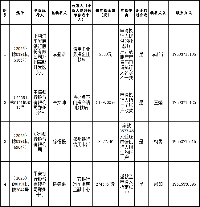 为进一步严格管理执行案款发放,强化执行案款管理,依法维护当事人合法权益,防范廉政风险,确保执行案款发放规范有序、及时高效。根据《最高人民法院关于执行款物管理工作的规定》及《最高人民法院关于进一步规范人民法院执行案款收发的通知》等相关规定,现对以下执行案款发放事宜进行公示,公示期为3个自然日(2025年10月31日—2025年11月2日),案件当事人或者其他利害关系人如有异议应当在公示期内提出并提交相关证据材料,公示期满无异的,本院将按照执行案款管理的相关规定办理发放手续。
