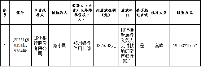 郑州高新技术产业开发区人民法院执行局向申请人以外的单位或个人发放案款的公示(2025年11月1日) 发布时间:2025-11-01 10:22:28