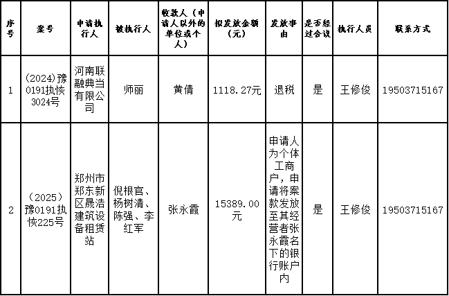 为进一步严格管理执行案款发放,强化执行案款管理,依法维护当事人合法权益,防范廉政风险,确保执行案款发放规范有序、及时高效。根据《最高人民法院关于执行款物管理工作的规定》及《最高人民法院关于进一步规范人民法院执行案款收发的通知》等相关规定,现对以下执行案款发放事宜进行公示,公示期为3个自然日(2025年11月17日—2025年11月19日),案件当事人或者其他利害关系人如有异议应当在公示期内提出并提交相关证据材料,公示期满无异的,本院将按照执行案款管理的相关规定办理发放手续。