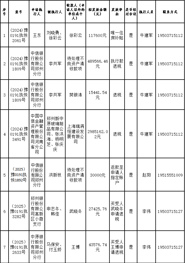 为进一步严格管理执行案款发放,强化执行案款管理,依法维护当事人合法权益,防范廉政风险,确保执行案款发放规范有序、及时高效。根据《最高人民法院关于执行款物管理工作的规定》及《最高人民法院关于进一步规范人民法院执行案款收发的通知》等相关规定,现对以下执行案款发放事宜进行公示,公示期为3个自然日(2025年11月21日—2025年11月23日),案件当事人或者其他利害关系人如有异议应当在公示期内提出并提交相关证据材料,公示期满无异的,本院将按照执行案款管理的相关规定办理发放手续。