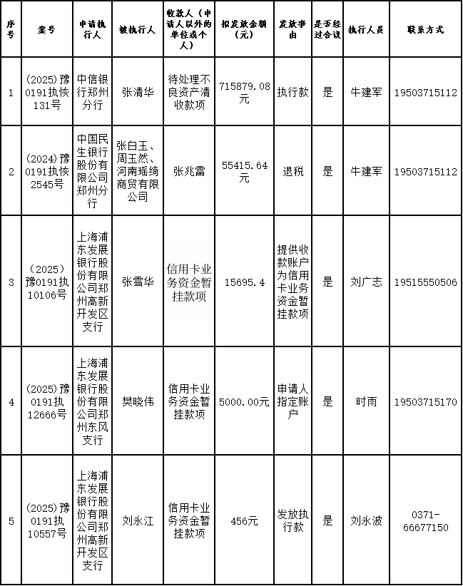为进一步严格管理执行案款发放,强化执行案款管理,依法维护当事人合法权益,防范廉政风险,确保执行案款发放规范有序、及时高效。根据《最高人民法院关于执行款物管理工作的规定》及《最高人民法院关于进一步规范人民法院执行案款收发的通知》等相关规定,现对以下执行案款发放事宜进行公示,公示期为3个自然日(2025年11月27日—2025年11月29日),案件当事人或者其他利害关系人如有异议应当在公示期内提出并提交相关证据材料,公示期满无异的,本院将按照执行案款管理的相关规定办理发放手续。
