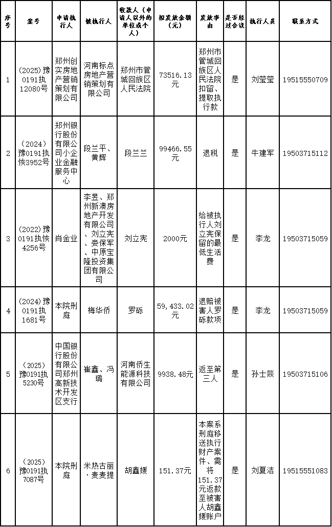 为进一步严格管理执行案款发放,强化执行案款管理,依法维护当事人合法权益,防范廉政风险,确保执行案款发放规范有序、及时高效。根据《最高人民法院关于执行款物管理工作的规定》及《最高人民法院关于进一步规范人民法院执行案款收发的通知》等相关规定,现对以下执行案款发放事宜进行公示,公示期为3个自然日(2025年12月3日—2025年12月5日),案件当事人或者其他利害关系人如有异议应当在公示期内提出并提交相关证据材料,公示期满无异的,本院将按照执行案款管理的相关规定办理发放手续。