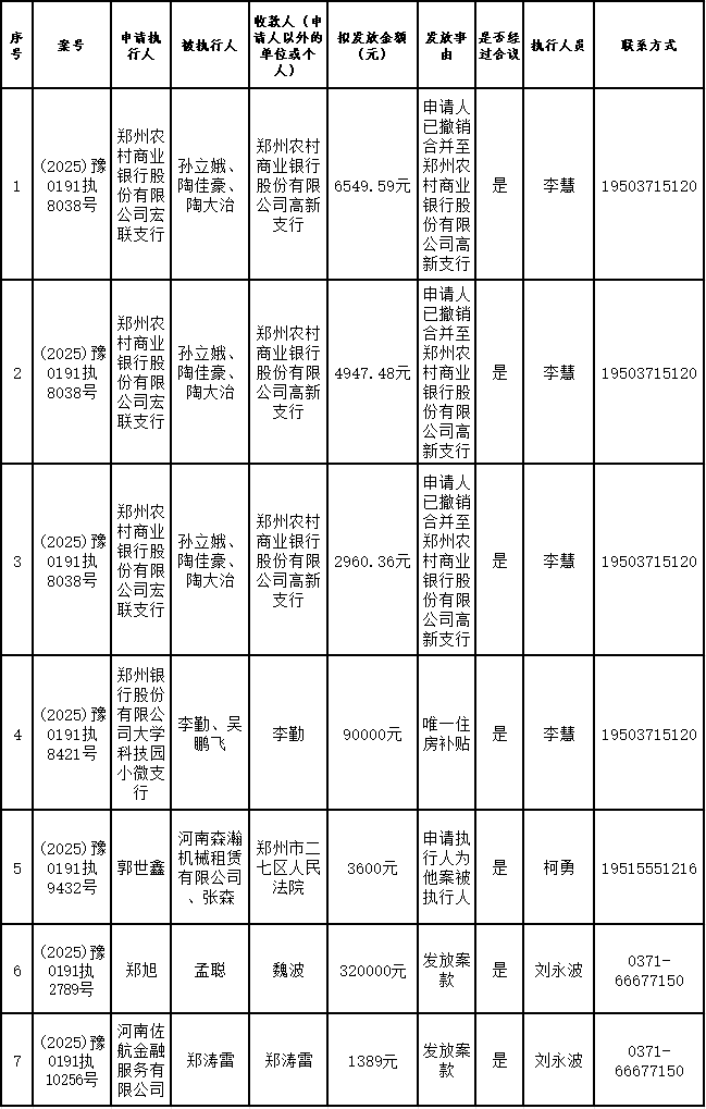 为进一步严格管理执行案款发放,强化执行案款管理,依法维护当事人合法权益,防范廉政风险,确保执行案款发放规范有序、及时高效。根据《最高人民法院关于执行款物管理工作的规定》及《最高人民法院关于进一步规范人民法院执行案款收发的通知》等相关规定,现对以下执行案款发放事宜进行公示,公示期为3个自然日(2025年12月9日—2025年12月11日),案件当事人或者其他利害关系人如有异议应当在公示期内提出并提交相关证据材料,公示期满无异的,本院将按照执行案款管理的相关规定办理发放手续。