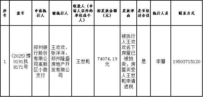为进一步严格管理执行案款发放,强化执行案款管理,依法维护当事人合法权益,防范廉政风险,确保执行案款发放规范有序、及时高效。根据《最高人民法院关于执行款物管理工作的规定》及《最高人民法院关于进一步规范人民法院执行案款收发的通知》等相关规定,现对以下执行案款发放事宜进行公示,公示期为3个自然日(2025年12月25日—2025年12月27日),案件当事人或者其他利害关系人如有异议应当在公示期内提出并提交相关证据材料,公示期满无异的,本院将按照执行案款管理的相关规定办理发放手续。