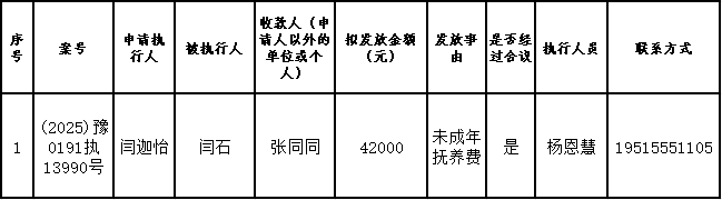 为进一步严格管理执行案款发放,强化执行案款管理,依法维护当事人合法权益,防范廉政风险,确保执行案款发放规范有序、及时高效。根据《最高人民法院关于执行款物管理工作的规定》及《最高人民法院关于进一步规范人民法院执行案款收发的通知》等相关规定,现对以下执行案款发放事宜进行公示,公示期为3个自然日(2026年1月4日—2026年1月6日),案件当事人或者其他利害关系人如有异议应当在公示期内提出并提交相关证据材料,公示期满无异的,本院将按照执行案款管理的相关规定办理发放手续。