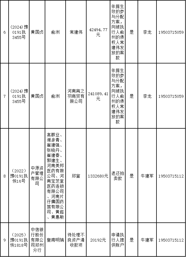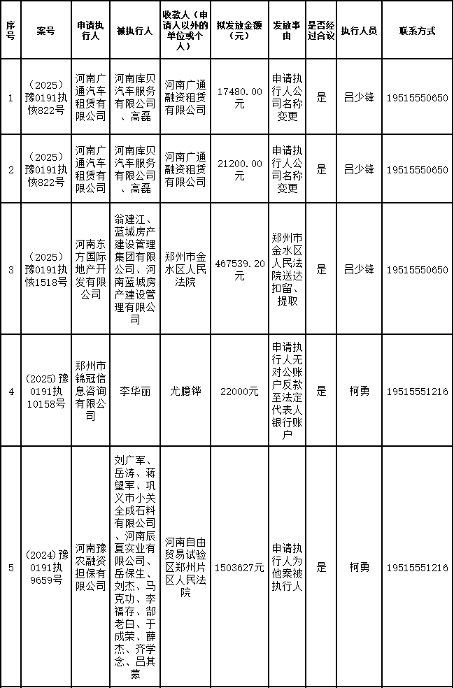 为进一步严格管理执行案款发放,强化执行案款管理,依法维护当事人合法权益,防范廉政风险,确保执行案款发放规范有序、及时高效。根据《最高人民法院关于执行款物管理工作的规定》及《最高人民法院关于进一步规范人民法院执行案款收发的通知》等相关规定,现对以下执行案款发放事宜进行公示,公示期为3个自然日(2026年1月8日—2026年1月10日),案件当事人或者其他利害关系人如有异议应当在公示期内提出并提交相关证据材料,公示期满无异的,本院将按照执行案款管理的相关规定办理发放手续。