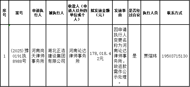 为进一步严格管理执行案款发放,强化执行案款管理,依法维护当事人合法权益,防范廉政风险,确保执行案款发放规范有序、及时高效。根据《最高人民法院关于执行款物管理工作的规定》及《最高人民法院关于进一步规范人民法院执行案款收发的通知》等相关规定,现对以下执行案款发放事宜进行公示,公示期为3个自然日(2026年1月20日—2026年1月22日),案件当事人或者其他利害关系人如有异议应当在公示期内提出并提交相关证据材料,公示期满无异的,本院将按照执行案款管理的相关规定办理发放手续。