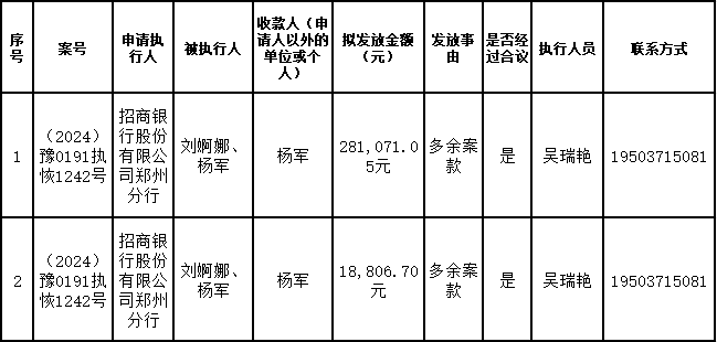 为进一步严格管理执行案款发放,强化执行案款管理,依法维护当事人合法权益,防范廉政风险,确保执行案款发放规范有序、及时高效。根据《最高人民法院关于执行款物管理工作的规定》及《最高人民法院关于进一步规范人民法院执行案款收发的通知》等相关规定,现对以下执行案款发放事宜进行公示,公示期为3个自然日(2026年1月26日—2026年1月28日),案件当事人或者其他利害关系人如有异议应当在公示期内提出并提交相关证据材料,公示期满无异的,本院将按照执行案款管理的相关规定办理发放手续。