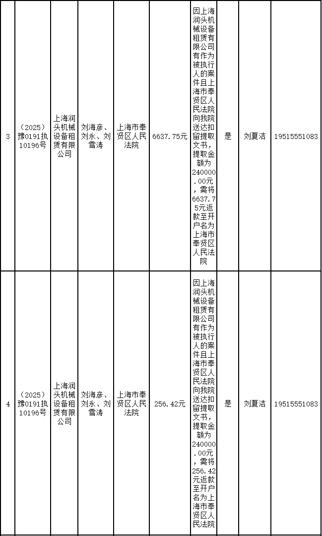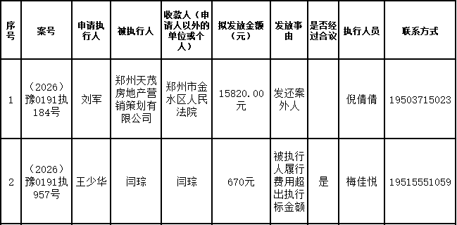 为进一步严格管理执行案款发放,强化执行案款管理,依法维护当事人合法权益,防范廉政风险,确保执行案款发放规范有序、及时高效。根据《最高人民法院关于执行款物管理工作的规定》及《最高人民法院关于进一步规范人民法院执行案款收发的通知》等相关规定,现对以下执行案款发放事宜进行公示,公示期为3个自然日(2026年1月30日—2026年2月1日),案件当事人或者其他利害关系人如有异议应当在公示期内提出并提交相关证据材料,公示期满无异的,本院将按照执行案款管理的相关规定办理发放手续。