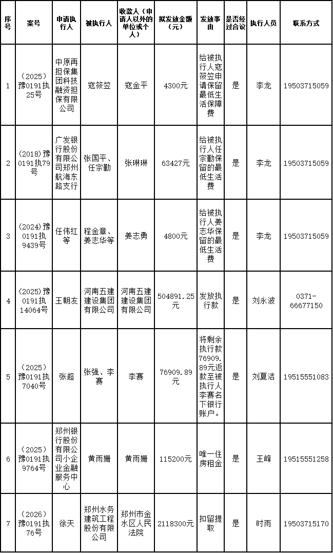 为进一步严格管理执行案款发放,强化执行案款管理,依法维护当事人合法权益,防范廉政风险,确保执行案款发放规范有序、及时高效。根据《最高人民法院关于执行款物管理工作的规定》及《最高人民法院关于进一步规范人民法院执行案款收发的通知》等相关规定,现对以下执行案款发放事宜进行公示,公示期为3个自然日(2026年2月6日—2026年2月8日),案件当事人或者其他利害关系人如有异议应当在公示期内提出并提交相关证据材料,公示期满无异的,本院将按照执行案款管理的相关规定办理发放手续。