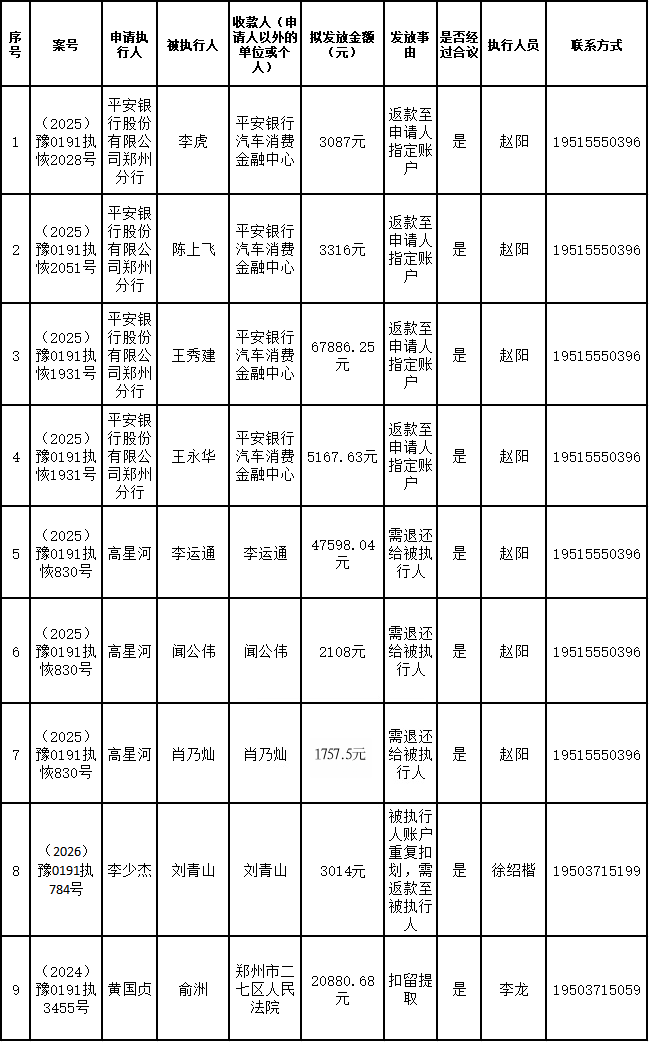 为进一步严格管理执行案款发放,强化执行案款管理,依法维护当事人合法权益,防范廉政风险,确保执行案款发放规范有序、及时高效。根据《最高人民法院关于执行款物管理工作的规定》及《最高人民法院关于进一步规范人民法院执行案款收发的通知》等相关规定,现对以下执行案款发放事宜进行公示,公示期为3个自然日(2026年2月9日—2026年2月11日),案件当事人或者其他利害关系人如有异议应当在公示期内提出并提交相关证据材料,公示期满无异的,本院将按照执行案款管理的相关规定办理发放手续。
