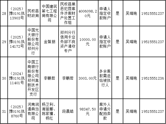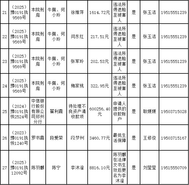 为进一步严格管理执行案款发放,强化执行案款管理,依法维护当事人合法权益,防范廉政风险,确保执行案款发放规范有序、及时高效。根据《最高人民法院关于执行款物管理工作的规定》及《最高人民法院关于进一步规范人民法院执行案款收发的通知》等相关规定,现对以下执行案款发放事宜进行公示,公示期为3个自然日(2026年2月10日—2026年2月12日),案件当事人或者其他利害关系人如有异议应当在公示期内提出并提交相关证据材料,公示期满无异的,本院将按照执行案款管理的相关规定办理发放手续。
