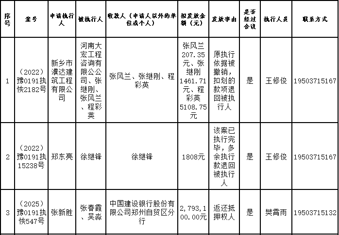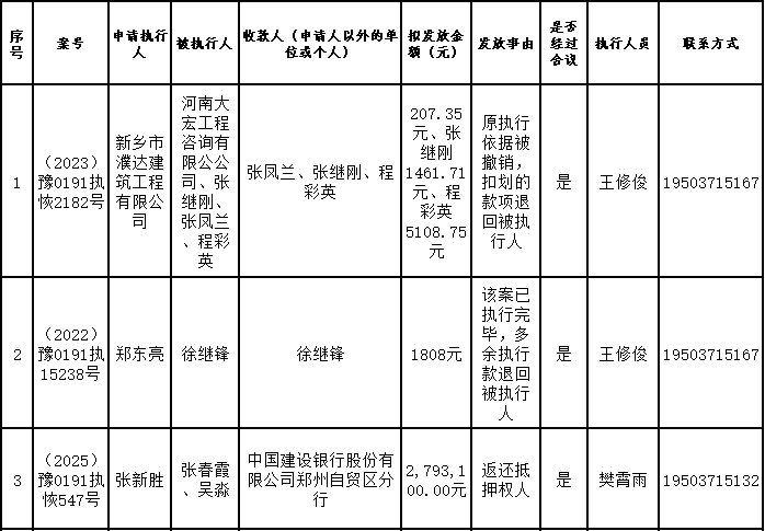 为进一步严格管理执行案款发放,强化执行案款管理,依法维护当事人合法权益,防范廉政风险,确保执行案款发放规范有序、及时高效。根据《最高人民法院关于执行款物管理工作的规定》及《最高人民法院关于进一步规范人民法院执行案款收发的通知》等相关规定,现对以下执行案款发放事宜进行公示,公示期为3个自然日(2026年2月13日—2026年2月15日),案件当事人或者其他利害关系人如有异议应当在公示期内提出并提交相关证据材料,公示期满无异的,本院将按照执行案款管理的相关规定办理发放手续。