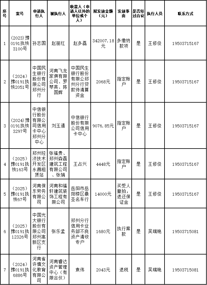 为进一步严格管理执行案款发放,强化执行案款管理,依法维护当事人合法权益,防范廉政风险,确保执行案款发放规范有序、及时高效。根据《最高人民法院关于执行款物管理工作的规定》及《最高人民法院关于进一步规范人民法院执行案款收发的通知》等相关规定,现对以下执行案款发放事宜进行公示,公示期为3个自然日(2026年2月14日—2026年2月16日),案件当事人或者其他利害关系人如有异议应当在公示期内提出并提交相关证据材料,公示期满无异的,本院将按照执行案款管理的相关规定办理发放手续。