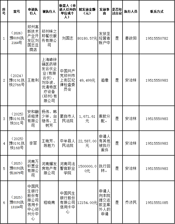 为进一步严格管理执行案款发放,强化执行案款管理,依法维护当事人合法权益,防范廉政风险,确保执行案款发放规范有序、及时高效。根据《最高人民法院关于执行款物管理工作的规定》及《最高人民法院关于进一步规范人民法院执行案款收发的通知》等相关规定,现对以下执行案款发放事宜进行公示,公示期为3个自然日(2026年2月28日—2026年3月2日),案件当事人或者其他利害关系人如有异议应当在公示期内提出并提交相关证据材料,公示期满无异的,本院将按照执行案款管理的相关规定办理发放手续。