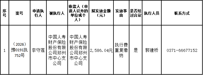 为进一步严格管理执行案款发放,强化执行案款管理,依法维护当事人合法权益,防范廉政风险,确保执行案款发放规范有序、及时高效。根据《最高人民法院关于执行款物管理工作的规定》及《最高人民法院关于进一步规范人民法院执行案款收发的通知》等相关规定,现对以下执行案款发放事宜进行公示,公示期为3个自然日(2026年3月2日—2026年3月4日),案件当事人或者其他利害关系人如有异议应当在公示期内提出并提交相关证据材料,公示期满无异的,本院将按照执行案款管理的相关规定办理发放手续。