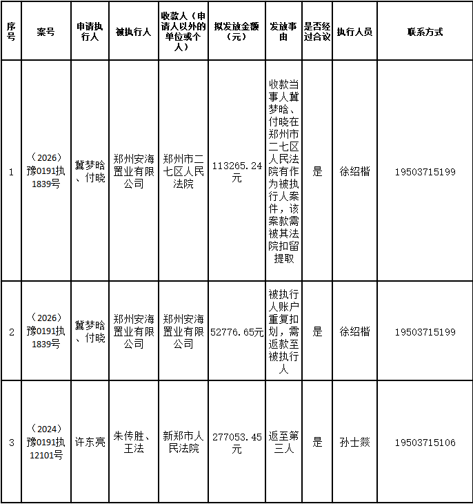 为进一步严格管理执行案款发放,强化执行案款管理,依法维护当事人合法权益,防范廉政风险,确保执行案款发放规范有序、及时高效。根据《最高人民法院关于执行款物管理工作的规定》及《最高人民法院关于进一步规范人民法院执行案款收发的通知》等相关规定,现对以下执行案款发放事宜进行公示,公示期为3个自然日(2026年3月11日—2026年3月13日),案件当事人或者其他利害关系人如有异议应当在公示期内提出并提交相关证据材料,公示期满无异的,本院将按照执行案款管理的相关规定办理发放手续。