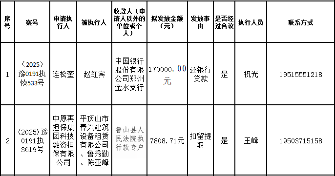 为进一步严格管理执行案款发放,强化执行案款管理,依法维护当事人合法权益,防范廉政风险,确保执行案款发放规范有序、及时高效。根据《最高人民法院关于执行款物管理工作的规定》及《最高人民法院关于进一步规范人民法院执行案款收发的通知》等相关规定,现对以下执行案款发放事宜进行公示,公示期为3个自然日(2026年3月13日—2026年3月15日),案件当事人或者其他利害关系人如有异议应当在公示期内提出并提交相关证据材料,公示期满无异的,本院将按照执行案款管理的相关规定办理发放手续。