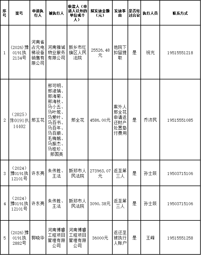 为进一步严格管理执行案款发放,强化执行案款管理,依法维护当事人合法权益,防范廉政风险,确保执行案款发放规范有序、及时高效。根据《最高人民法院关于执行款物管理工作的规定》及《最高人民法院关于进一步规范人民法院执行案款收发的通知》等相关规定,现对以下执行案款发放事宜进行公示,公示期为3个自然日(2026年3月25日—2026年3月27日),案件当事人或者其他利害关系人如有异议应当在公示期内提出并提交相关证据材料,公示期满无异的,本院将按照执行案款管理的相关规定办理发放手续。
