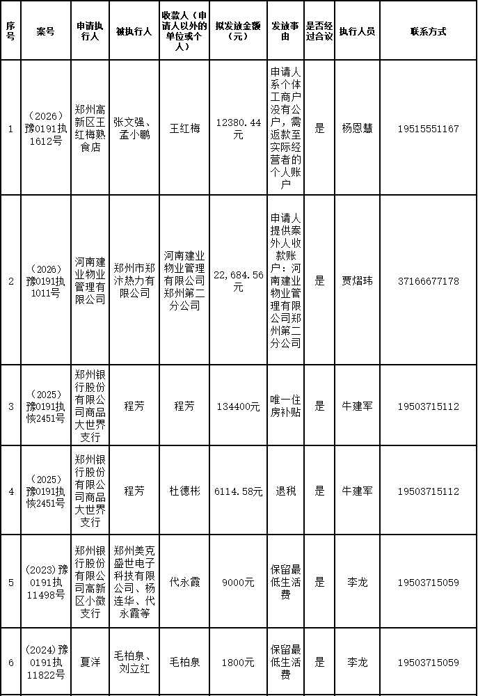 为进一步严格管理执行案款发放,强化执行案款管理,依法维护当事人合法权益,防范廉政风险,确保执行案款发放规范有序、及时高效。根据《最高人民法院关于执行款物管理工作的规定》及《最高人民法院关于进一步规范人民法院执行案款收发的通知》等相关规定,现对以下执行案款发放事宜进行公示,公示期为3个自然日(2026年3月26日—2026年3月28日),案件当事人或者其他利害关系人如有异议应当在公示期内提出并提交相关证据材料,公示期满无异的,本院将按照执行案款管理的相关规定办理发放手续。