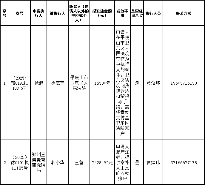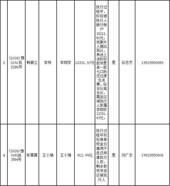 为进一步严格管理执行案款发放,强化执行案款管理,依法维护当事人合法权益,防范廉政风险,确保执行案款发放规范有序、及时高效。根据《最高人民法院关于执行款物管理工作的规定》及《最高人民法院关于进一步规范人民法院执行案款收发的通知》等相关规定,现对以下执行案款发放事宜进行公示,公示期为3个自然日(2026年4月1日—2026年4月3日),案件当事人或者其他利害关系人如有异议应当在公示期内提出并提交相关证据材料,公示期满无异的,本院将按照执行案款管理的相关规定办理发放手续。