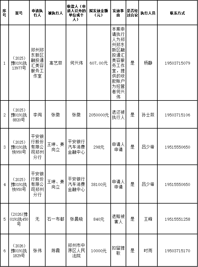 为进一步严格管理执行案款发放,强化执行案款管理,依法维护当事人合法权益,防范廉政风险,确保执行案款发放规范有序、及时高效。根据《最高人民法院关于执行款物管理工作的规定》及《最高人民法院关于进一步规范人民法院执行案款收发的通知》等相关规定,现对以下执行案款发放事宜进行公示,公示期为3个自然日(2026年4月10日—2026年4月12日),案件当事人或者其他利害关系人如有异议应当在公示期内提出并提交相关证据材料,公示期满无异的,本院将按照执行案款管理的相关规定办理发放手续。