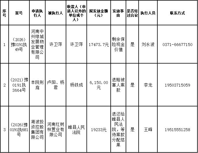 为进一步严格管理执行案款发放,强化执行案款管理,依法维护当事人合法权益,防范廉政风险,确保执行案款发放规范有序、及时高效。根据《最高人民法院关于执行款物管理工作的规定》及《最高人民法院关于进一步规范人民法院执行案款收发的通知》等相关规定,现对以下执行案款发放事宜进行公示,公示期为3个自然日(2026年4月21日—2026年4月23日),案件当事人或者其他利害关系人如有异议应当在公示期内提出并提交相关证据材料,公示期满无异的,本院将按照执行案款管理的相关规定办理发放手续。